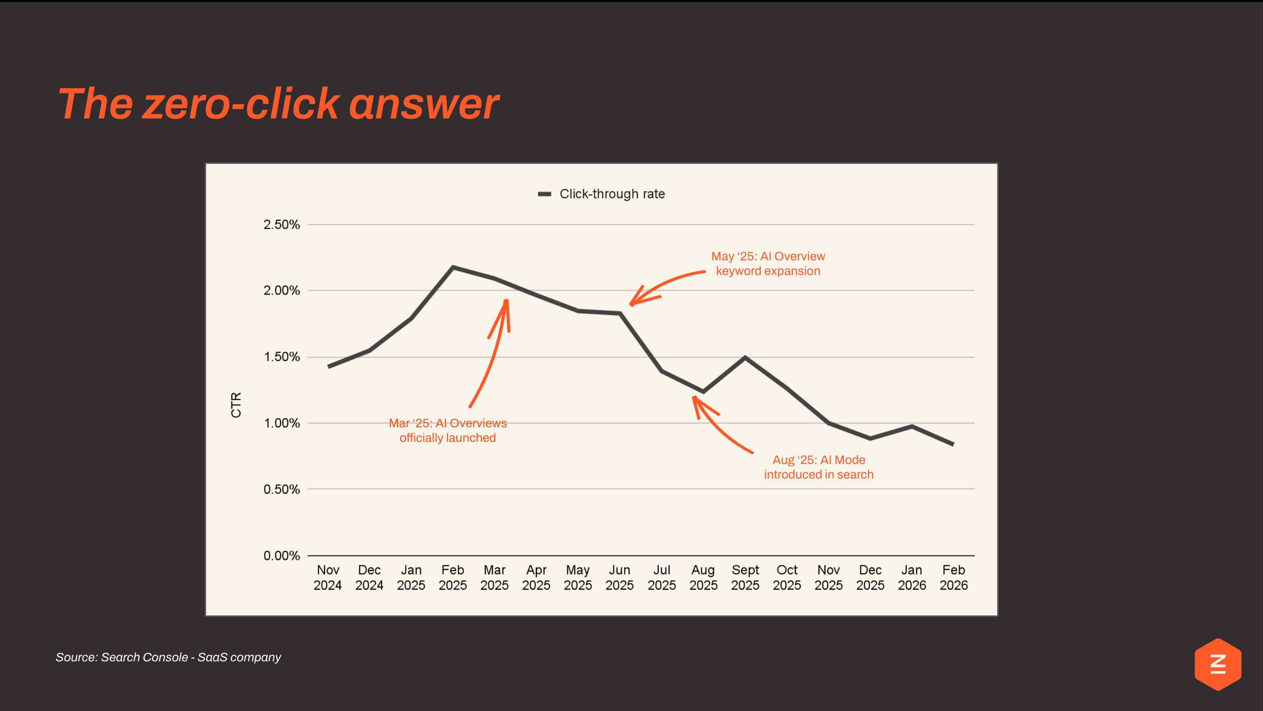 The data is already showing it. As AI Overviews rolled out, click-through rates didn’t just fluctuate — they declined. March: launch. A peak, then a drop. May: expansion, further decline. August: full AI mode, another step change down.