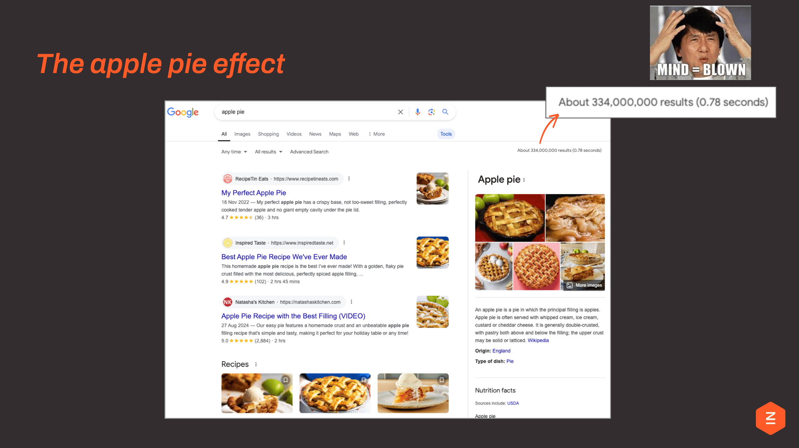 Search for something as simple as “apple pie” and you’ll find over 300 million results. But we don’t need 300 million apple pie recipes. What’s happened is we’ve optimised for ranking, not for differentiation. The result? Content that is increasingly interchangeable, and far too much of it.